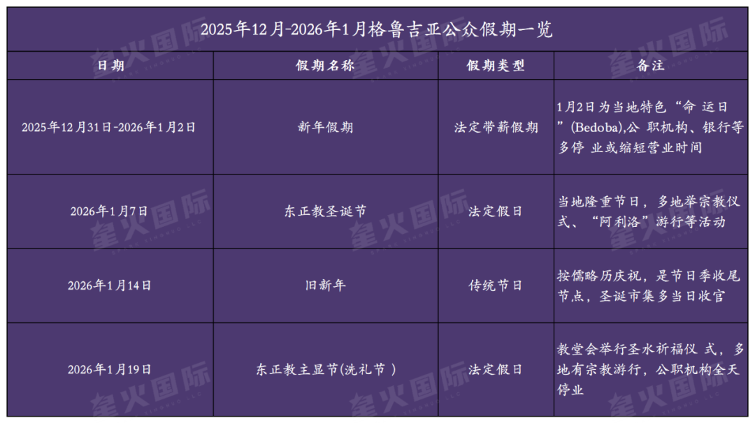 您好!为方便大家顺利赴格鲁吉亚开展考察、进项或接娃事宜,现将2025年12月-2026年1月格鲁吉亚完整假期及出行注意事项通知如下,望各位提前合理规划行程,避免耽误相关安排。1. 2025年12月31日-2026年1月2日:新年假期(全国法定带薪假期),其中1月2日为当地特色“命运日”(Bedoba)。节日期间,公职机构、银行及部分商铺将停业或缩短营业时间,全城节日氛围将持续至1月14日。2. 2026年1月7日:东正教圣诞节(核心法定假日),这是格鲁吉亚最隆重的节日之一。当日多地会举行宗教仪式、“阿利洛”游行及家庭团聚活动,第比利斯圣三一教堂会举办大型礼拜活动。3. 2026年1月14日:旧新年,按儒略历庆祝,是当地节日季的收尾节点。各地圣诞市集多在当日收官,部分商家会推出尾货促销活动。4. 2026年1月19日:东正教主显节(法定假日),又称“洗礼节”。当日教堂会举行圣水祈福仪式,多地同步开展宗教游行,公职机构全天停业。1. 签证与证件:中国公民可免签入境格鲁吉亚,单次停留最长30天,180日内累积停留不超过90天。请务必确保护照有效期超过计划停留时间3个月以上,同时提前准备好接娃相关文件的原件及复印件。2. 行程规划:1月当地节日密集,1日、2日、7日、19日为法定假日,建议避开这些日期办理考察对接、接娃手续等重要事务,请务必提前与我司确认行程细节。3. 生活与交通:节日期间,第比利斯、巴统等城市会开放圣诞村、特色市集等活动,部分路段可能实施临时交通管控。建议尽早预订往返机票与住宿,避免出现临时无房或价格大幅上涨的情况。4. 文化注意:宗教节日期间进入教堂,需遵守着装规范,避免穿着暴露服饰;参与当地活动时请尊重传统习俗,不要随意拍摄宗教仪式的核心环节。如需进一步了解格鲁吉亚当地办事流程、节日期间交通避堵攻略或接娃行程定制建议,可随时联系星火国际工作人员咨询。预祝大家出行顺利,事务办理圆满,一路好孕。