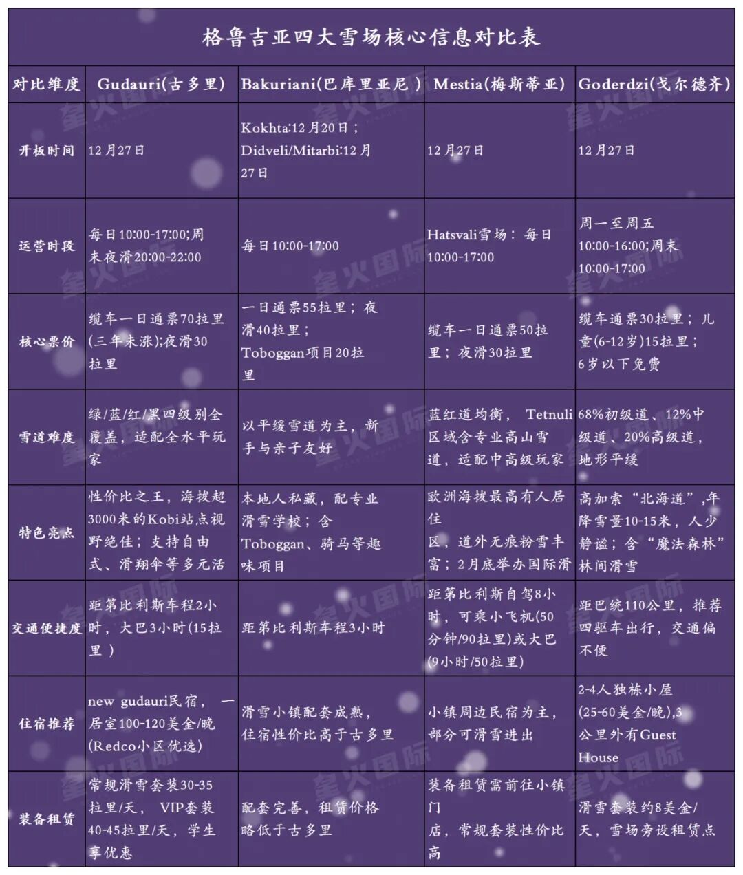 想必大家早有耳闻,格鲁吉亚外高加索山脉藏着不输阿尔卑斯的优质粉雪,蓬松细腻的雪质能带来极致滑行体验。更惊喜的是,这里的滑雪成本仅为阿尔卑斯雪场的五分之一,超高性价比直接戳中人心!恰逢格鲁吉亚四大雪场本周起陆续开板,无论你是顺路打卡的休闲玩家,还是专程奔赴的滑雪爱好者,都能在这里找到心仪雪道。这个冬天,跟着星火国际奔赴格鲁吉亚,在雪山之巅邂逅好孕与极致滑行的双重快乐吧!格鲁吉亚滑雪季官宣!四大雪场本周起陆续开板票价三年不涨格鲁吉亚滑雪场运营官网正式官宣,四大热门雪场本周起将逐步开放缆车、解锁各大赛道。其中Bakuriani滑雪场率先开板,12月20日即可开启畅滑模式。星火小编整理了四大雪场的核心攻略,速来收藏!• 票务福利:缆车一日通票70拉里,不限乘坐次数,且该价格已连续三年维持原价,性价比拉满;周末开放夜滑场次,仅需30拉里就能体验暮色中的雪道飞驰。• 首期开放缆车站点:覆盖Pirveli(Marco Polo酒店旁)、Soliko(new Gudauri民宿核心区)、Gudauri、Kobi(海拔超3000米,视野绝佳)、Firni及Truso,满足不同滑行需求。• 住宿贴士:滑雪场周边酒店价格偏高,推荐选择new gudauri附近的民宿,一居室均价100-120美金,Redco等小区都是不错的选择。Bakuriani滑雪场|亲子友好本地人私藏宝藏雪场• 开放时间:Kokhta滑雪场12月20日率先迎客,Didveli与Mitarbi雪场12月27日同步开放• 票价详情:一日通票55拉里,夜滑40拉里;还有趣味十足的Toboggan项目,仅需20拉里就能收获满满快乐。• 雪场特色:作为本地人最爱的雪场,这里坡度平缓,是青少年学习滑雪的绝佳场地,配备专业滑雪学校与课程,新手也能安心入门。除了滑雪,Toboggan滑行与骑马体验更是不容错过的限定乐趣。• 运营时段:Hatsvali雪场每日10:00-17:00• 雪场亮点:雪场分为Hatsvali与tetnuli两大区域,二者距离较远。Hatsvali雪场毗邻小镇,租赁装备需前往镇上;tetnuli雪场深藏山中,属于专业高山雪场,更适合中级及以上滑雪玩家挑战。2月底这里将举办国际滑雪赛事,往年均可免费观赛,感兴趣的朋友还能登录官网申请赛事志愿者,近距离感受专业赛事的热血氛围。Goderdzi滑雪场|小众秘境高加索的“北海道”• 运营时段:周一至周五10:00-16:00,周末延长至17:00• 票务价格:缆车通票仅需30拉里,堪称雪场性价比天花板• 雪场优势:作为格鲁吉亚最新且规模最小的滑雪场,Goderdzi凭借极佳的雪质圈粉无数,被誉为“高加索的北海道”。目前这里交通不算便利,游客相对稀少,雪道体验感绝佳,特别适合从巴统出发的玩家,来一场远离人潮的静谧滑雪之旅。
